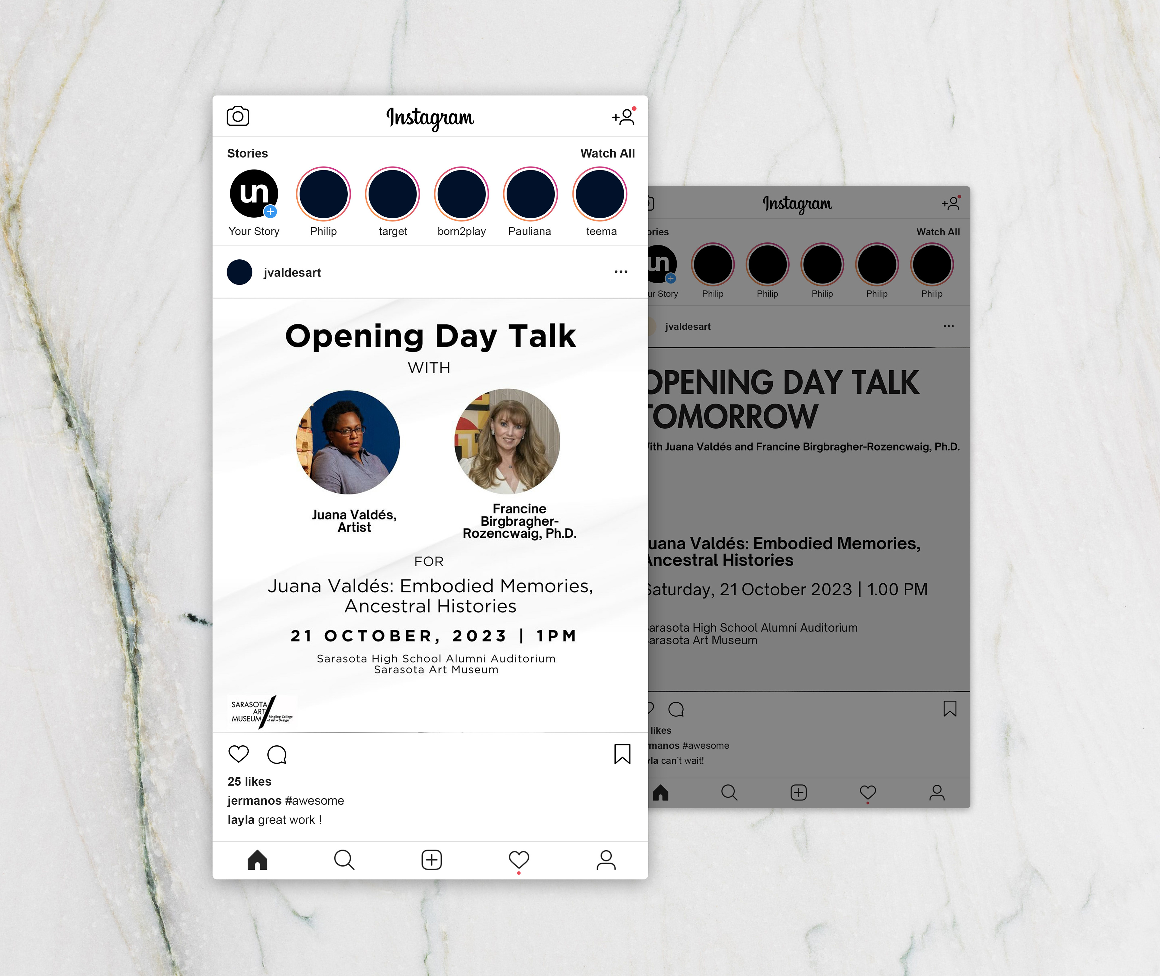 This series of social media graphics was created to promote this artist's upcoming exhibition, launched by an opening day talk. This client wanted a clean and minimalist look that would allow the art of their page to stand out.